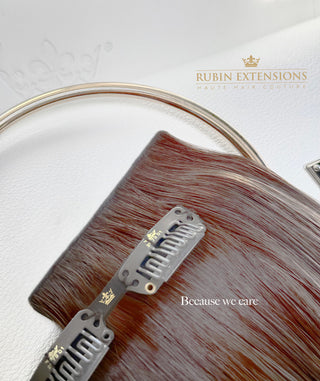 Clip-in Extensions sind Echthaar Extensions, die mittels Metall-Clips am Eigenhaar angebracht werden. Der grosse Vorteil von Clip-in Extensions liegt in der einfachen Handhabung. Die Hair-Clips werden nach jedem Tragen wieder herausgenommen und aufbewahrt. So können sie immer wieder verwendet werden. Rubin Clip-in Extensions aus Echthaar kannst du bereits vor dem Einsetzen stylen. Auf diese Weise sparst du morgens Zeit. Hast du beispielsweise einen frühen Termin, dann mache dir einfach am Vorabend Locken in deine Clip-ins. Am Morgen brauchst du sie dann einfach nur noch einsetzen! Über Nacht verstaust du sie am besten im praktischen Extensions-Bag, damit sie nicht verknoten.